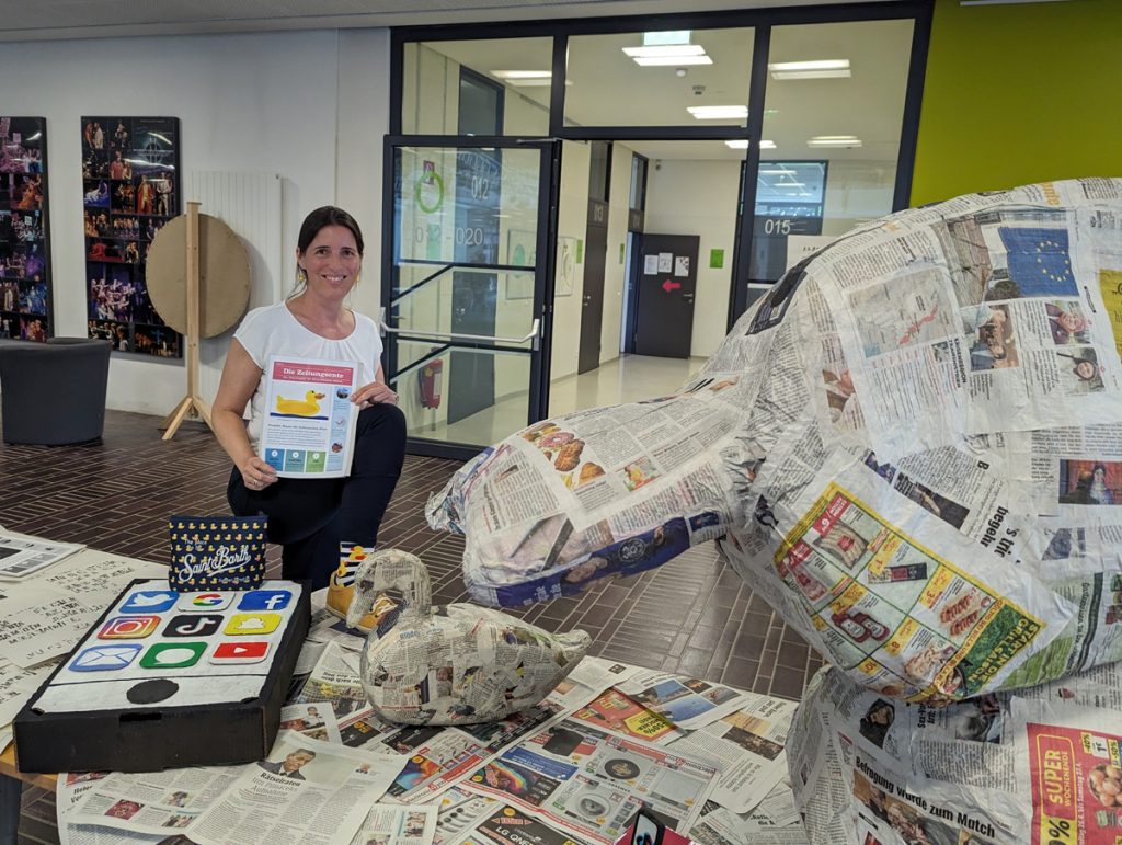 Down on the ground floor a duck took centre stage. This huge creation, made out of newspapers, pointed the way to the exhibition “Know the Information Flow”. The second and fourth forms (Digital Education, Technology & Design) worked together on this informative project. Fake news was discussed and newspapers created with fake and real news. Students also visited a real newspaper office before creating their own newspapers, which were available for purchase on the evening. Definitely a cool project!!