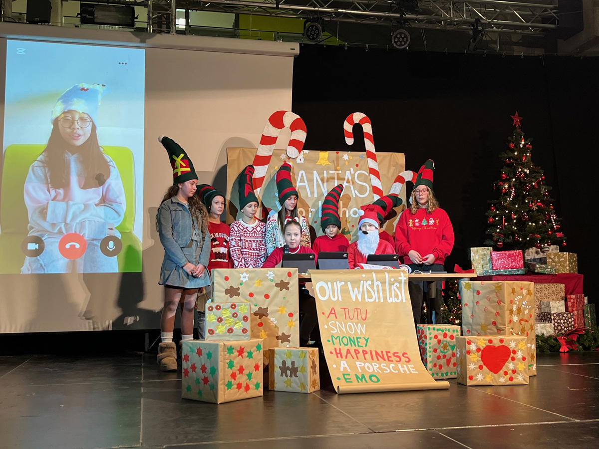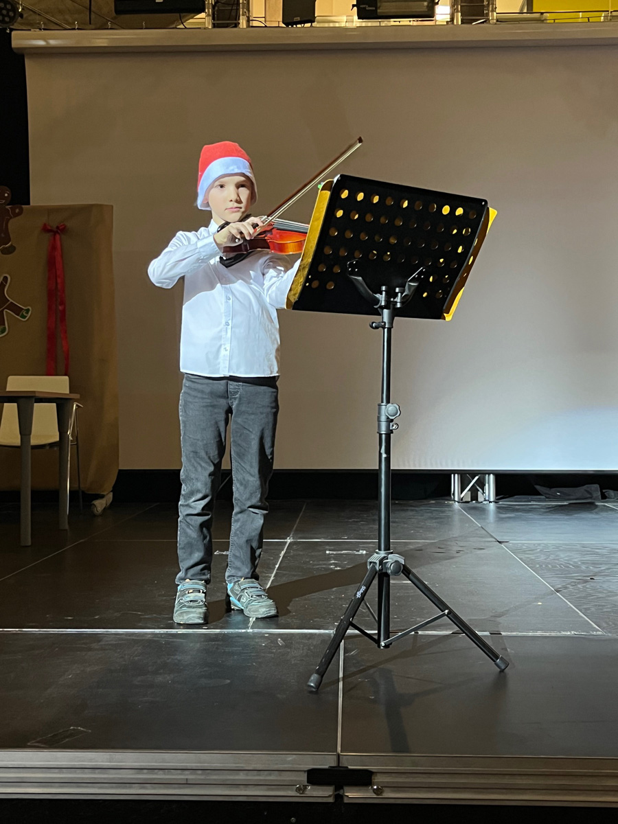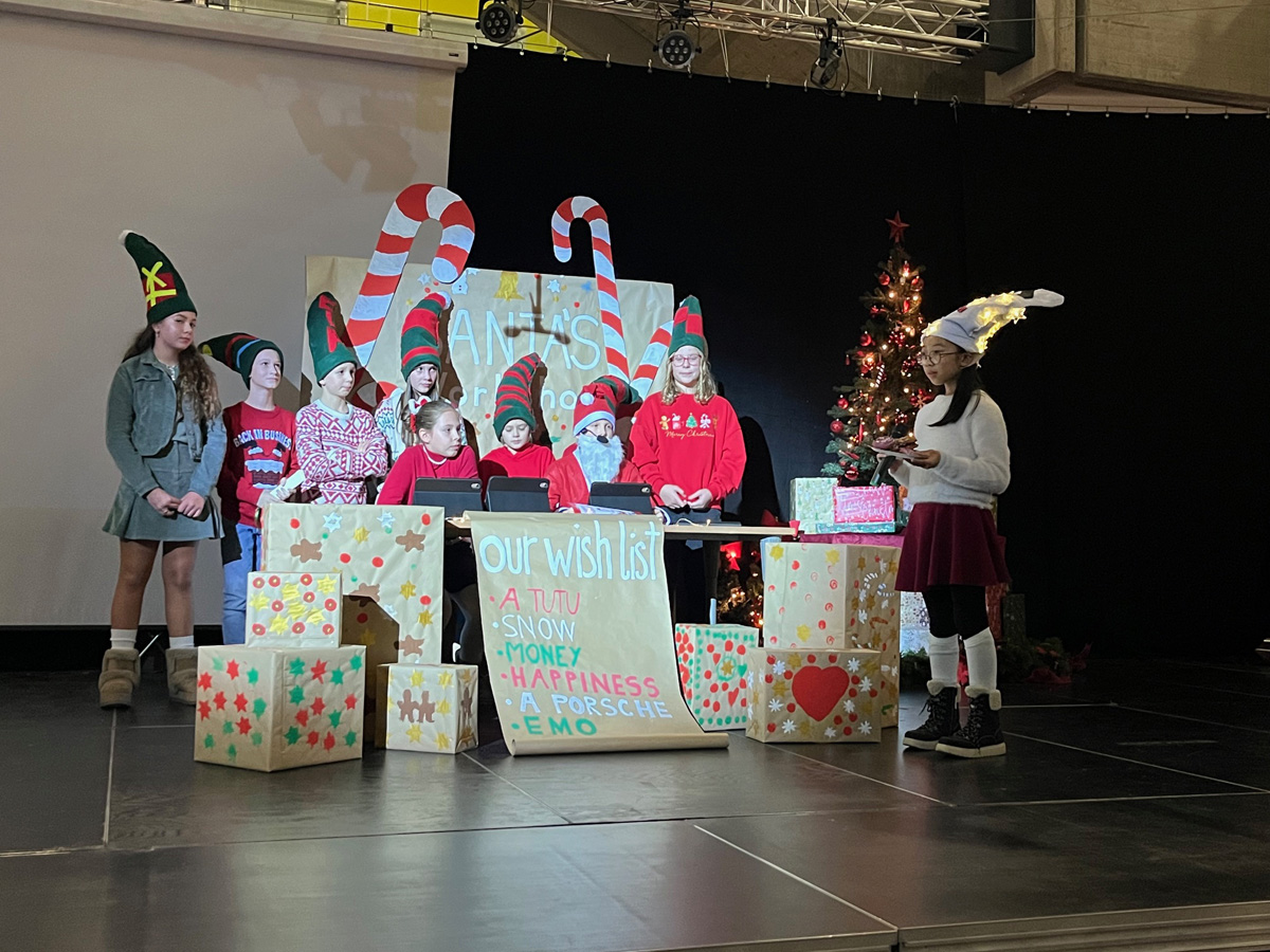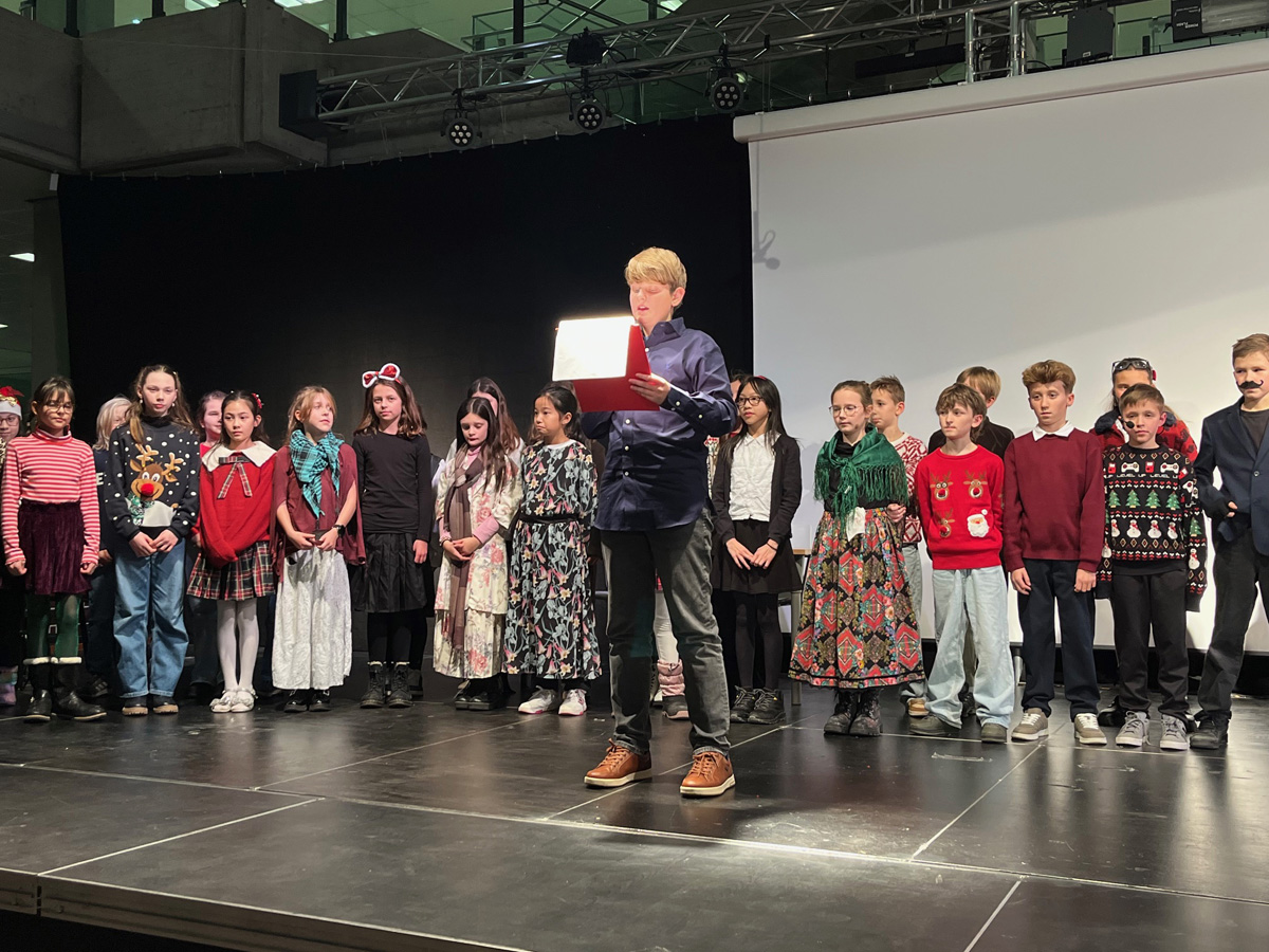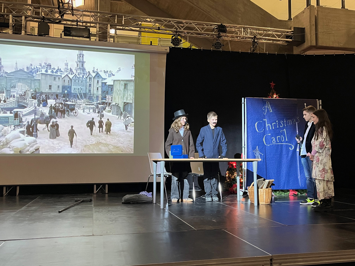 Finally, it was time for the presenters Aaron, Alicia and Jesse to start the proceedings. After 1B had finished their dance to Santa Claus is coming to town, the first play Santa goes Digital was performed. The plays and music were carefully chosen to reflect the passing of time because the International Bilingual Classes are celebrating their 30-years anniversary this year. On the one hand we performed a modern play about Santa and his many technical issues, on the other hand we performed the very old-fashioned Charles Dickens classic A Christmas Carol. Poems were recited by Philipp, Frederick, Juna and Lilly and there were instrumental parts of the programme too, thanks to Noah, Moritz, and Manuel.