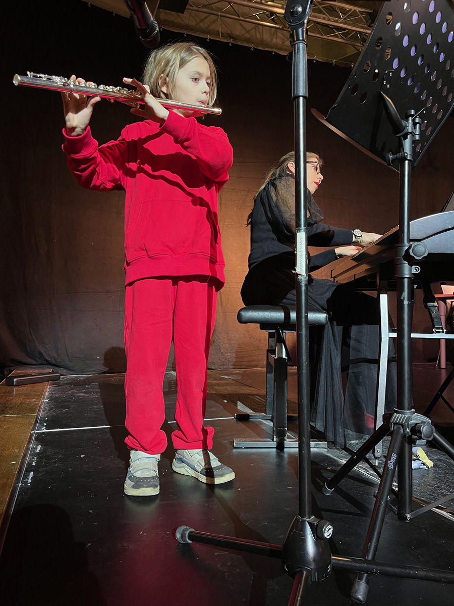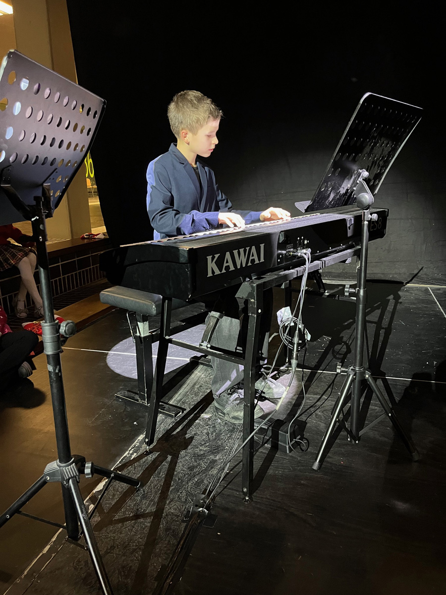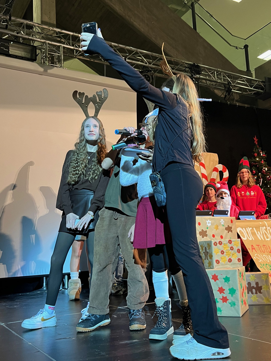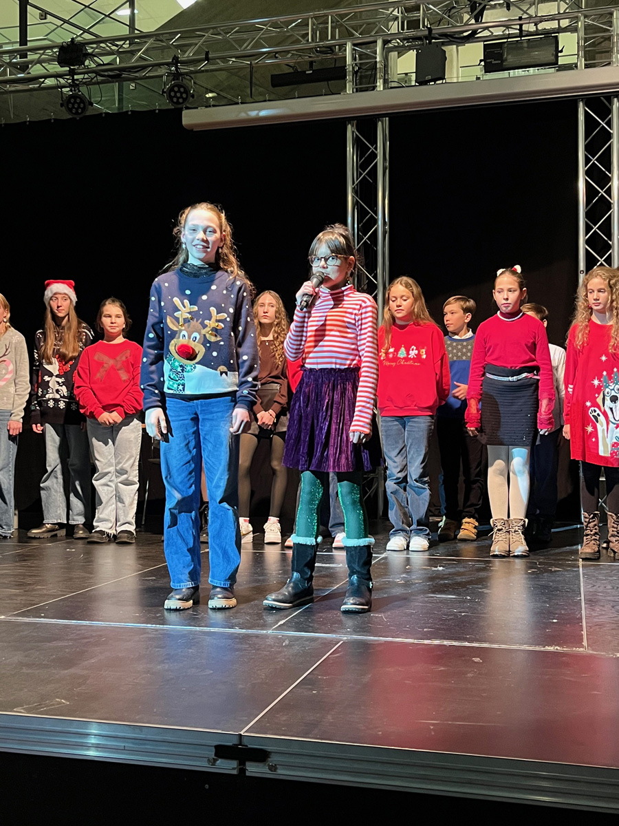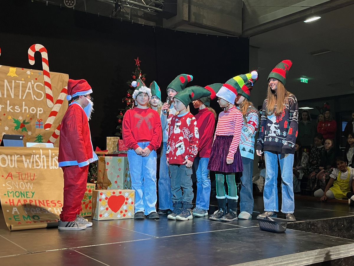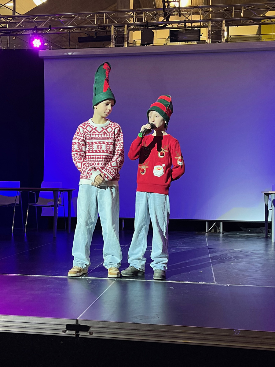 Finally, it was time for the presenters Aaron, Alicia and Jesse to start the proceedings. After 1B had finished their dance to Santa Claus is coming to town, the first play Santa goes Digital was performed. The plays and music were carefully chosen to reflect the passing of time because the International Bilingual Classes are celebrating their 30-years anniversary this year. On the one hand we performed a modern play about Santa and his many technical issues, on the other hand we performed the very old-fashioned Charles Dickens classic A Christmas Carol. Poems were recited by Philipp, Frederick, Juna and Lilly and there were instrumental parts of the programme too, thanks to Noah, Moritz, and Manuel.