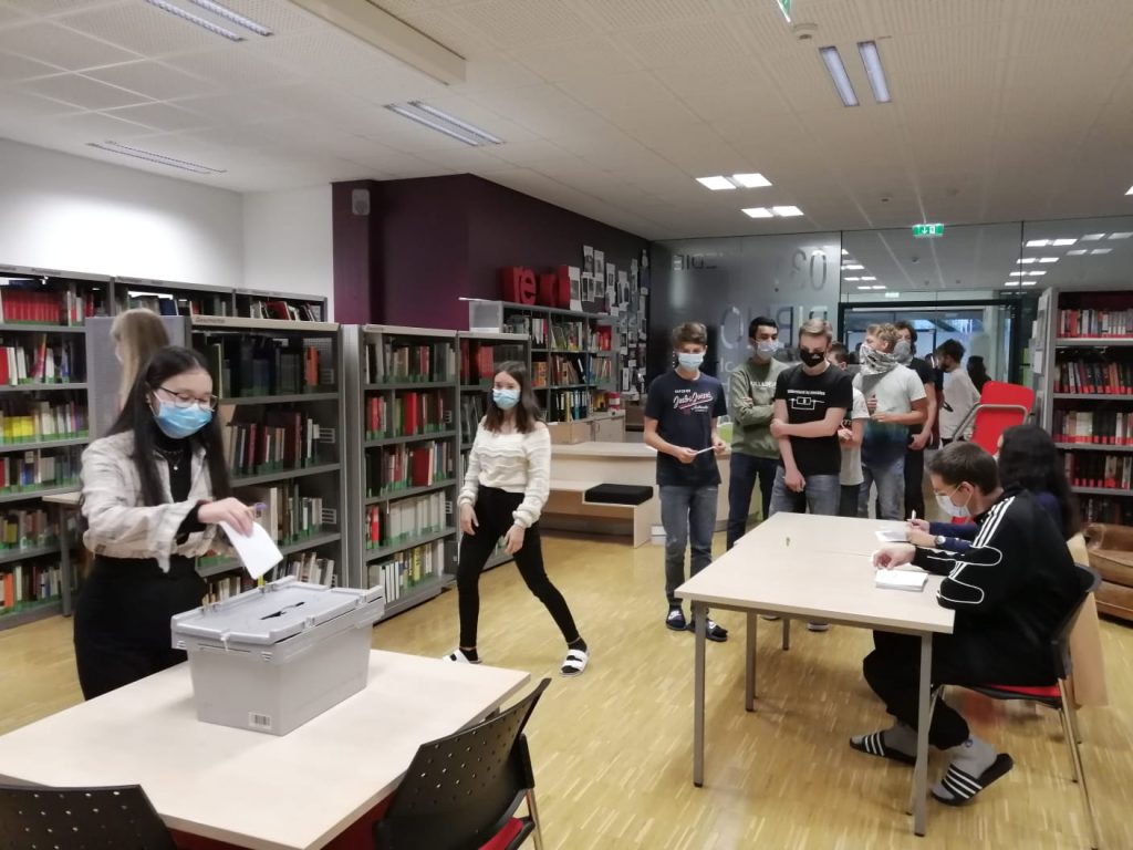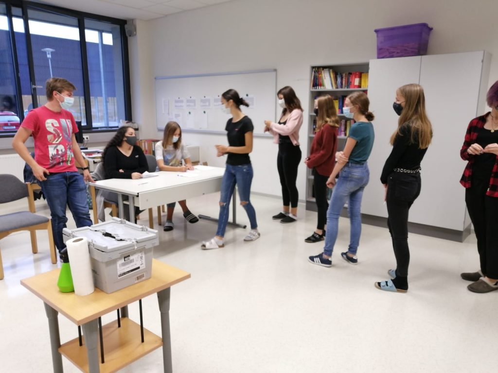 Zunächst wurde mit den KandidatInnen ein Video gedreht, in dem sie ihr Wahlprogramm präsentieren konnten. Diese Aufnahmen wurden den Oberstufenklassen am Tag vor der Wahl vorgespielt. Am Tag danach wurden die Klassen einzeln in die Wahllokale im Erdgeschoß gerufen, wo sie sich in den Wählerlisten registrierten und anschließend in den Wahlkabinen ihre Stimmzettel ausfüllten. Nach der Stimmabgabe in die versiegelten Urnen, kehrten die Schülerinnen und Schüler wieder in ihre Klassen zurück. Dieses Prozedere wiederholte sich am Tag darauf, als die Wahlberechtigten nochmals zur Stichwahl gerufen wurden. Der Ablauf der Wahl wurde durch die momentane Covid-19 Situation erschwert, doch schaffte es die Wahlkommission gut, durch den Einsatz von Desinfektionsmittel und ständigem Lüften, die Hygienevorgaben zu erfüllen. Außerdem muss hervorgehoben werden, dass unsere Schülerinnen und Schüler durch ihr diszipliniertes, besonnenes Verhalten zu einem reibungslosen Ablauf der gesamten Wahl beigetragen haben.